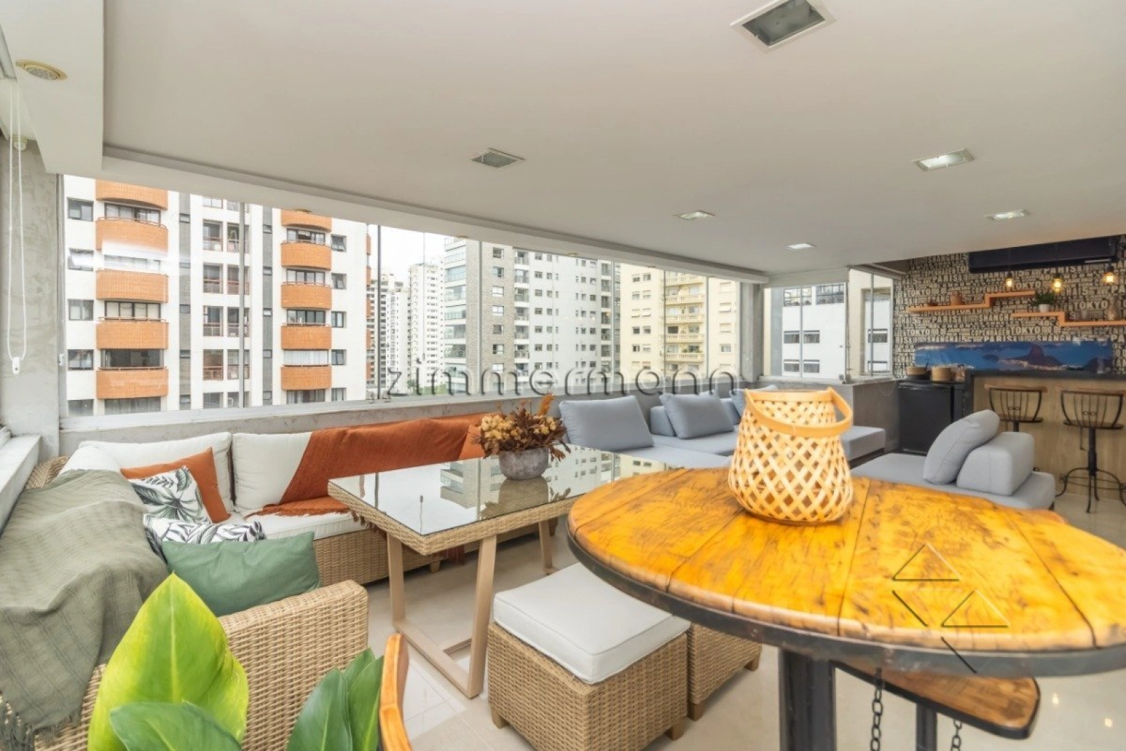 No andar superior, a cobertura se destaca por um espaço amplo e versátil, ideal para receber amigos e familiares. O ambiente conta com bar, sala de TV e está fechada com vidro, dando mais conforto aos moradores sem abrir mão da iluminação natural. Um espaço que oferece inúmeras possibilidades de personalização e criação de novos ambientes.